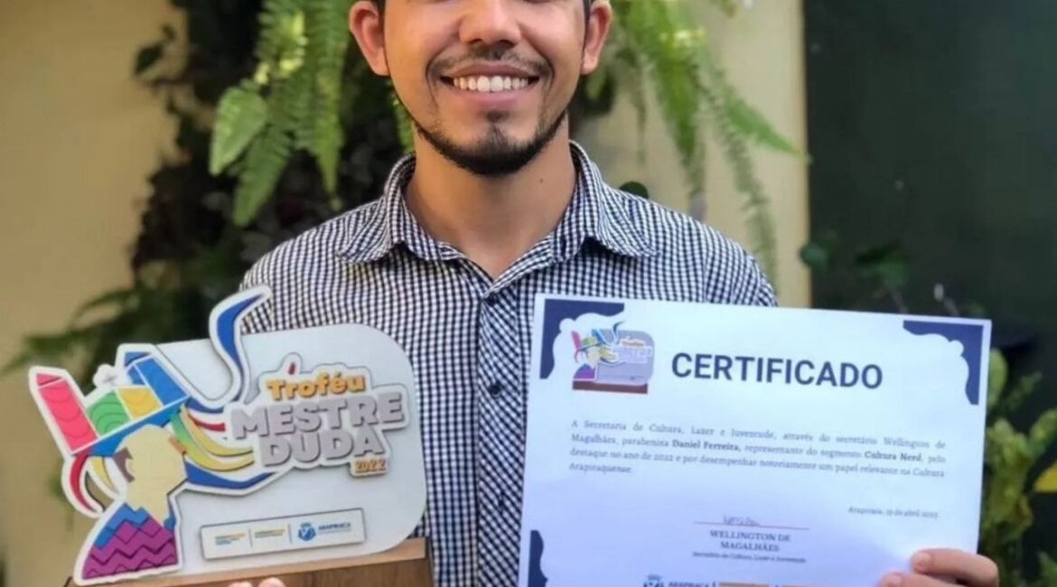 O professor Daniel Ferreira, da Escola Municipal Fernando Collor de Mello, no Povoado Canaã, recebeu no último dia 13 de abril de 2023 o mais importante troféu, Mestre Duda, que destaca as maiores personalidades e suas contribuições para a Cultura de Arapiraca no ano de 2022.